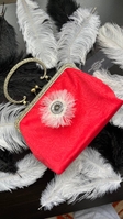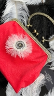 Exclusive coral-red clutch by Anastasia Kosse with removable brooch decor: 2-in-1 design! Features ostrich feather, sequins, and beads. A bold, handmade statement piece and a one-of-a-kind gift for her.
